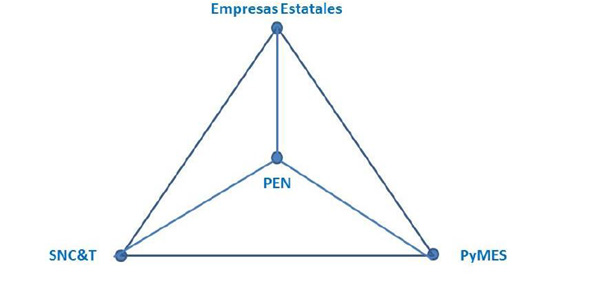 La opción de los grandes proyectos nacionales fue utilizada exitosamente por los gobiernos kirchneristas para el desarrollo autónomo de satélites, radares, centrales nucleares de baja potencia, aviones, tecnología para la explotación de hidrocarburos no convencionales, etc. Por otro lado estos grandes proyectos nacionales proporcionaron un fuerte impulso a las industrias Pyme y al SNCyT ya que su estilo tecnológico es el que se esquematiza en la Figura 2 [12].