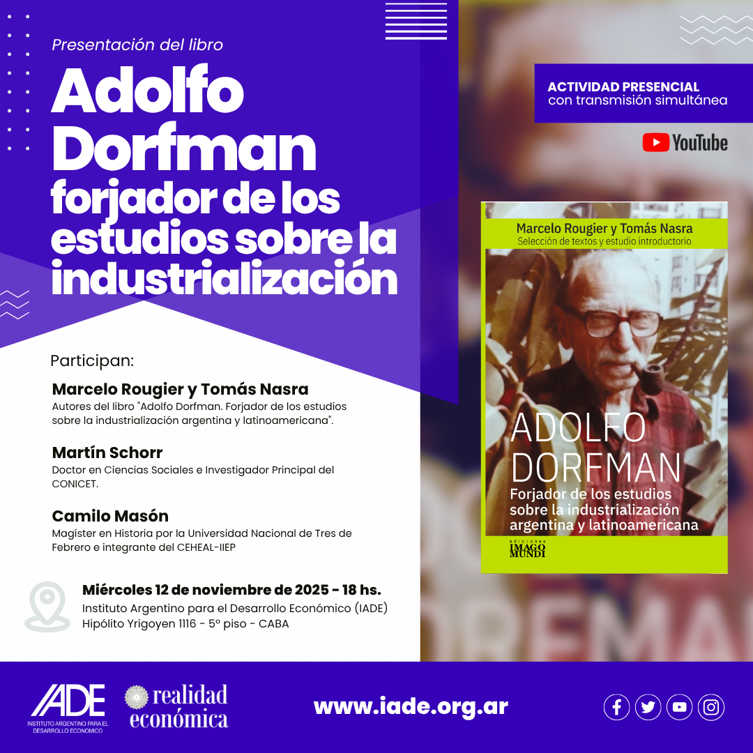 Presentación del libro Adolfo Dorfman, forjador de los estudios sobre la industrialización argentina y latinoamericana. Los autores abordan la obra y la figura de Adolfo Dorfman, quien fuera un investigador de referencia para el Instituto Argentino para el Desarrollo Económico. Se trata de poner de relieve a un férreo defensor de la industria y, a partir de ella, de la soberanía nacional.