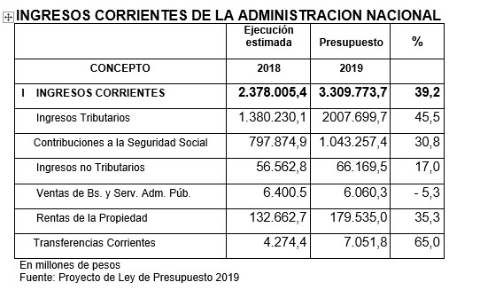 c) Ingresos No Tributarios: Lo calculan en $ 66.169,5 millones para el año 2019 (Aumento del 17% frente a 2018, y 0,36% del PBI). Estos comprenden los ingresos provenientes ingresos por tasas, regalías, derechos, alquileres, multas, y otros recursos no impositivos, y tiene cierta lógica ante una inflación estimada por ellos del 34,8% para el año 2019.