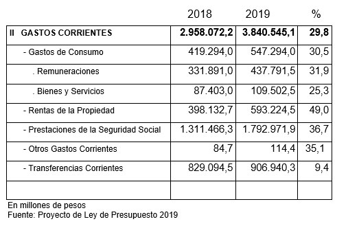 Siempre comparando los números del Proyecto de ley de Presupuesto 2019 con la ejecución estimada para todo este año 2018 en el mismo proyecto del ejercicio fiscal, los gastos corrientes se incrementan en un 29,8%, conformado básicamente por las remuneraciones (que pasan de $ 331.891 millones a $ 437.791,5 millones), cuando la administración nacional tiene previsto 363.624 cargos de los cuales el 57,9% de ellos pertenecen a las fuerzas armadas y de seguridad.