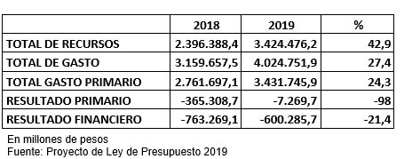 Proyectan que los recursos totales de la Administración Pública Nacional en el año 2019 alcancen los $3.424.476,2 millones (18,6% del PBI), incrementándose 42,9% frente a 2018.