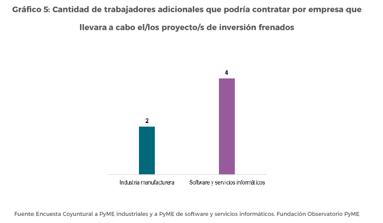 En términos de empleo, dada la difusión disímil de la condición de proyectos frenados según tamaño de empresa y los trabajadores adicionales que respectivamente podrían contratar de ejecutarse esos proyectos, entonces, se generarían aproximadamente 16 mil nuevos empleos, Entre las PyME de SSI con proyectos frenados la incorporación prevista rondaría los 1,2 mil nuevos trabajadores si estas firmas pudieran llevarlos a cabo.