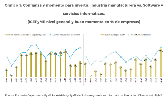 Si bien en SSI la propensión a invertir se ha más que duplicado entre octubre 2023 y abril 2024 (cuando la mejora de la confianza fue de un 40%), sólo alcanzó al 41% de las PyME del sector. En cambio, en la industria manufacturera la mayor confianza empresarial no ha tenido un correlato aún en una mejor perspectiva para la inversión en la coyuntura actual, con tan sólo 27% de las PyME (proporción similar a la de octubre y con una mejora de la confianza de 25%).