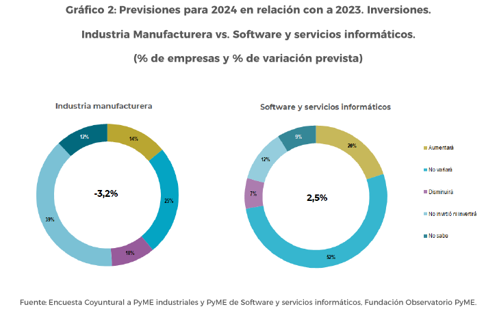 En cambio, entre las PyME de SSI sólo 1 de cada 10 no invertirá, 2 de cada 10 aumentarán y la mitad mantendrían las inversiones tal como en 2023. El volumen de inversión aumentaría en torno al 2-3%,