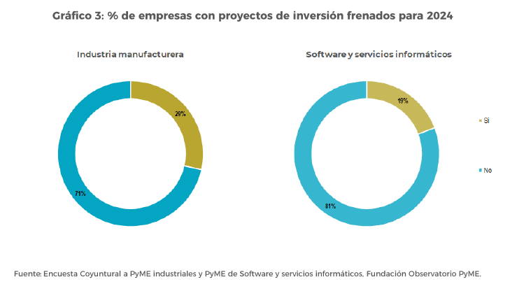 Consultadas durante el relevamiento de febrero, el 29% de las PyME manufactureras y el 19% de sus pares de SSI contaban con proyectos de inversión frenados para 2024 (estas últimas son también las empresas con mejores perspectivas de inversión, de acuerdo con “buen momento para invertir” analizado en la sección anterior).