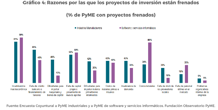 El primer lugar entre las razones se lo lleva la incertidumbre macroeconómica, tanto en la industria manufacturera (80% de las PyME con proyectos frenados) comoen el sector de informática (90%). La previsibilidad es más que necesaria para afrontar los esfuerzos que conllevan las inversiones productivas.