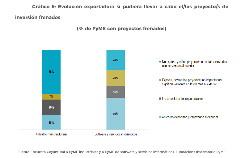 Con relación a la inserción internacional, el 55% de las PyME con proyectos frenados de SSI creen que podrían comenzar a exportar o aumentar sus exportaciones si pudieran llevarlos a cabo. Por el contrario, dada la relativa mayor orientación al mercado interno de la industria manufacturera, los proyectos de inversión frenados están mucho menos asociados a la posibilidad de exportar, como sucede en el 55% de estas PyME.