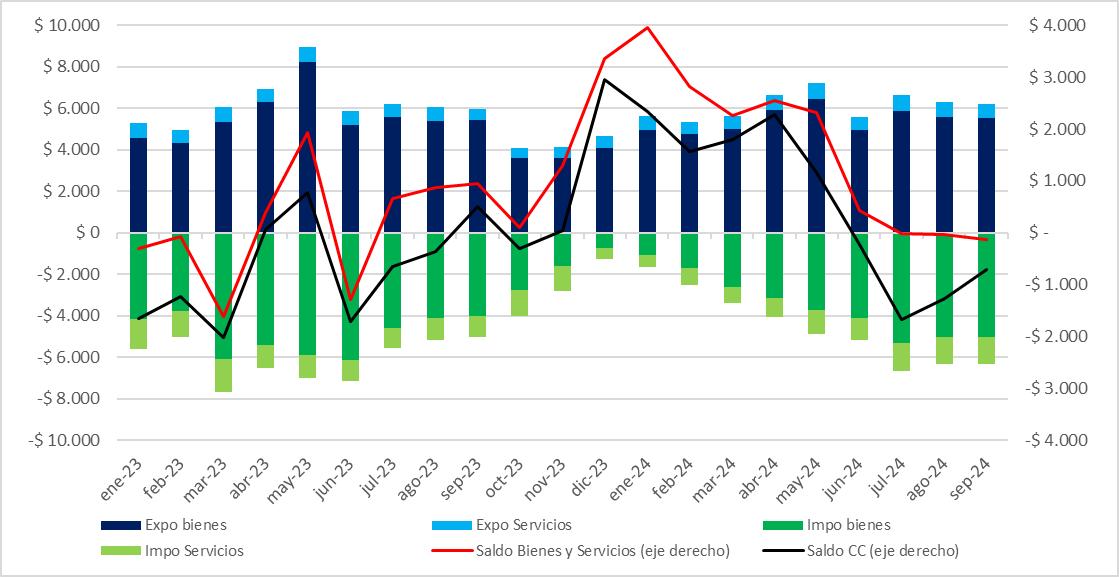 La apreciación cambiaria está llevando a que el saldo de la cuenta corriente se revierta a medida que el pago de importaciones de bienes se normaliza y crecen las importaciones de servicios. Desde julio, el saldo de la cuenta bienes y servicios comenzó a ser deficitaria, mientras que el total de la Cuenta Corriente —que también incluye el pago de intereses de la deuda con el FMI, entre otras cosas— lo es desde junio.