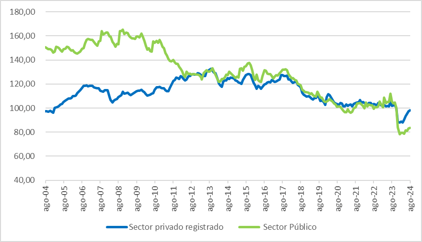 Lo anterior se da en un contexto en donde los salarios se recuperan parcialmente, pero están muy por debajo del pico de 2015. Además, lo hacen de forma muy heterogénea: mientras que el promedio de los salarios del sector privado registrado ya se encuentra prácticamente en el mismo nivel que noviembre-2023, los salarios del sector público —cerca de un 20% del total de trabajadores— llevan una pérdida acumulada del 16% durante el mismo período (Gráfico 2).