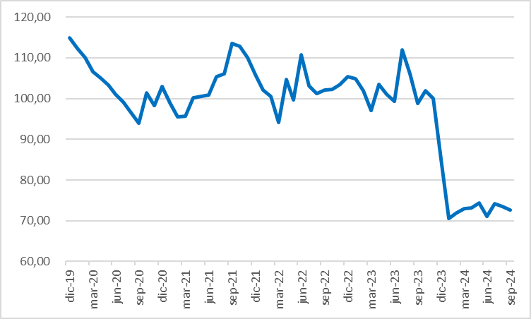 Luego del brutal salto devaluatorio de diciembre 2023, el proceso de desinflación se explica en gran medida a partir de la fuerte apreciación cambiaria producto de una tasa de devaluación mensual del 2% frente a una inflación sustancialmente más elevada.