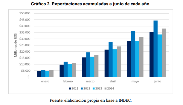 El aumento de las exportaciones —único “motor” de crecimiento con variación positiva—, no es suficiente para compensar la caída en el resto de las variables, atento que las mismas representan aproximadamente sólo entre el 20% y 25% del PBI . Además, el aumento no es tan importante si se lo compara con años anteriores a 2023 —donde las exportaciones cayeron considerablemente producto de la sequía—.