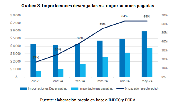 Ya con Milei, Caputo repitió su programa, una fuerte devaluación inicial seguido por crawling peg del 2% mensual, con tasas de interés que la superan —siendo negativas respecto a la inflación, pero positivas en dólares, que es lo que verdaderamente interesa a los capitales financieros foráneos—. Sin embargo, esta vez no hubo posibilidad de conseguir grandes créditos ya que todavía se encuentra pendiente de pago la deuda que había tomado en su gestión anterior —renegociada durante el gobierno de Alberto Fernandez—. La emisión de BOPREALES por aproximadamente 10 MM de dólares y postergar el pago de importaciones durante los primeros meses (ver Gráfico 3) sirvieron para sumar algunas reservas en un contexto de brutal recesión y fuerte caída en el nivel de importaciones. Ello permitió que los operadores locales no se dolaricen bruscamente, pero no alcanzó a generar confianza en los fondos internacionales que se abstuvieron de invertir en el país. Así, a sólo 7 meses de gestión, el agro retrasa la liquidación de la cosecha y corren los rumores de una nueva devaluación.