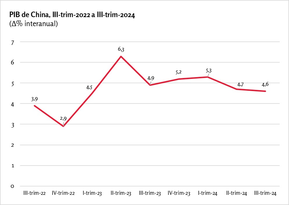 - El PIB de China subió un 4,6% interanual en el III-trim-2024, desacelerándose levemente contra el 4,7% registrado en el II-trim-2024.