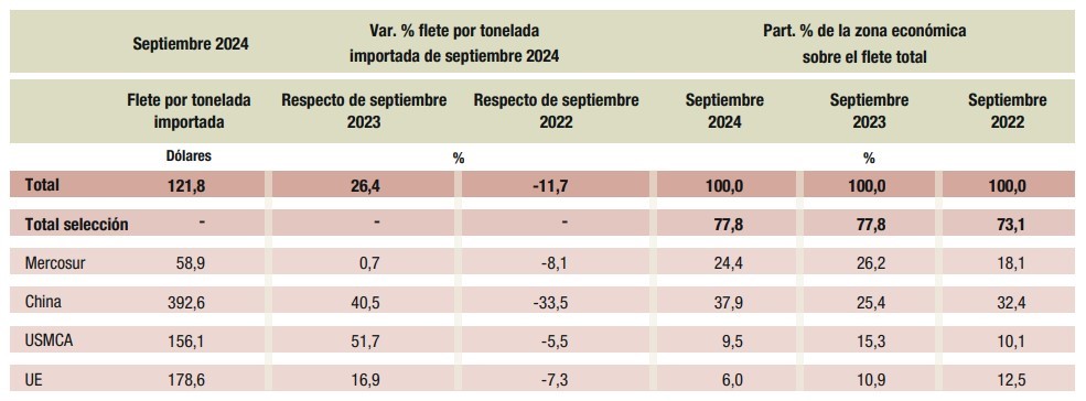 Fletes de importación por principales zonas económicas. En porcentaje. Septiembre 2024.