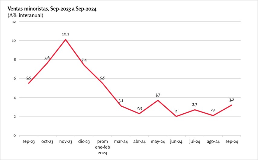- En ene-sep 2024, las ventas minoristas subieron un 3,3%.