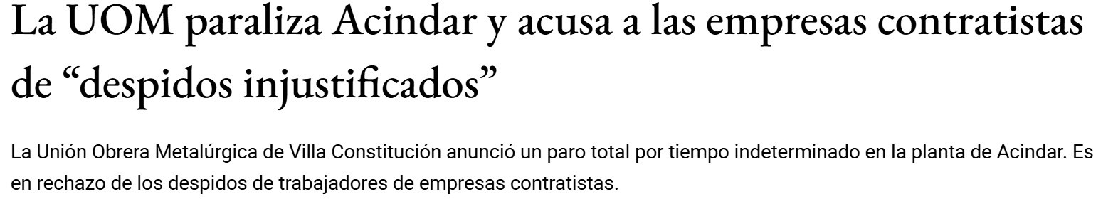 El subsector Metalúrgica y siderúrgica es el tercero más golpeado dentro del rubro de la Industria. Del total de conflictos laborales relevados, el 12,8% corresponde a este sector industrial. Algunos de los casos son: