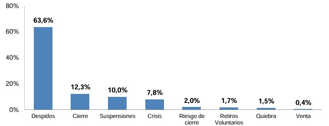 • Conflictividad: los mayores casos fueron Despidos (35,2%). Le siguen los casos de Crisis (20,5%), Cierre (21,9%), Suspensiones (9%) Riesgo de cierre de empresas (5,7%), Retiros voluntarios (2,9%), Quiebra (1,9%), Condiciones de trabajo y Reducción de la Jornada (1%) y Plantas paralizadas y Ventas (0,5%).