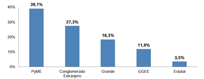 En el 71,5% de los casos se trató de empresas con capital de origen nacional, mientras que el 27,2% de los casos fueron empresas de capital extranjero, el 1,1% capital Mixto y el 0,1% de los casos fueron Cooperativas nacionales.
