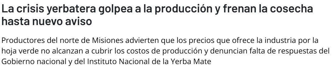 La producción de yerba mate en Misiones atraviesa una situación crítica que llevó a frenar la cosecha de hoja verde “hasta nuevo aviso”, como medida de protesta de los productores. La decisión se explica por los precios ofrecidos por la industria, que no alcanzan a cubrir los costos de producción, generando una fuerte pérdida de rentabilidad para pequeños y medianos yerbateros. La crisis impacta de manera directa en toda la cadena productiva: productores primarios, tareferos, secaderos y cooperativas, afectando el nivel de actividad y el empleo rural.