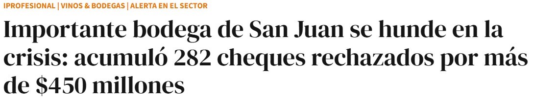 La tradicional bodega Casa Montes, con presencia histórica en el Valle de Tulum (San Juan) y responsable de marcas como Ampakama, Fuego Negro, Alzamora, Baltazar y Casa Montes, se encuentra hundida en una crisis financiera. Casos similares son los de las bodegas Bianchi y Norton en Mendoza.