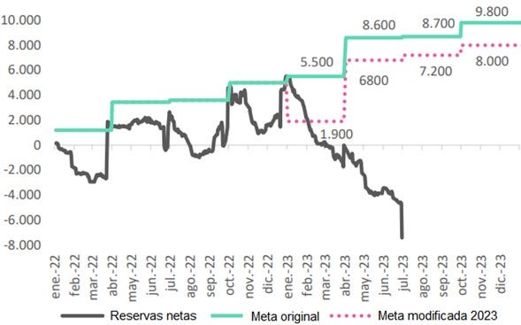 Por esto resulta tan importante la re-re-negociación del acuerdo (recordemos que hace tan solo 4 meses, cuando fue la revisión de las metas del cuarto trimestre del 2022, se renegoció un incremento de las metas de acumulación de reservas internacionales). En primer lugar, para destrabar los casi USD 4.000 millones no enviados, más todavía teniendo en cuenta que ahora en julio hay que pagar otros USD 2.700 millones. En segundo lugar, porque el gobierno busca, de mínima, otra modificación de las metas, amparado en el más que justificado impacto de la sequía, uno de los principales causantes del no cumplimiento de las metas (ya que impacta tanto en la caída de las exportaciones y, por ende, en la meta de acumulación de reservas, como también en la reducción de la recaudación vía los derechos de exportación y otros impuestos, que a su vez afectan la meta fiscal y la del financiamiento monetario). Y, de máxima, busca un adelantamiento de fondos, para poder engrosar las reservas y mejorar la posición financiera del BCRA.