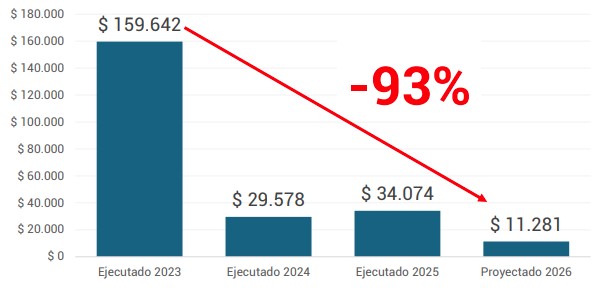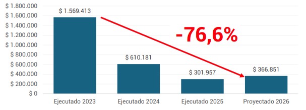 Lejos de cumplir con la ley, la asignación viene desplomándose desde que asumió Milei. En 2023 se ejecutó el 50,5% de lo que correspondía, en 2024 apenas 9,4%, en 2025 10,8% y, para 2026, el proyecto reduce la cifra a un ínfimo 3,5%.