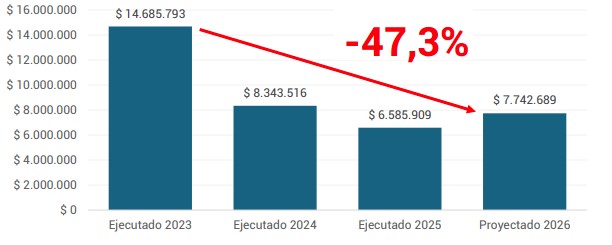 El ajuste en la educación técnico-profesional se inscribe en un recorte presupuestario mucho más amplio. La Función Educación y Cultura presenta una caída real del 47,3% en el Presupuesto 2026 respecto de lo efectivamente ejecutado en 2023.