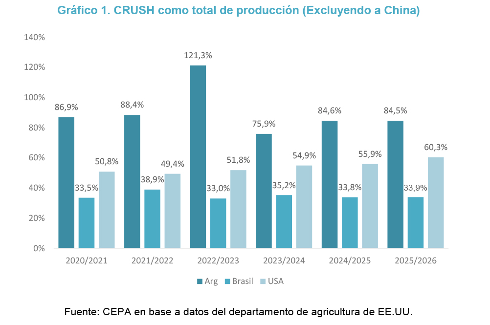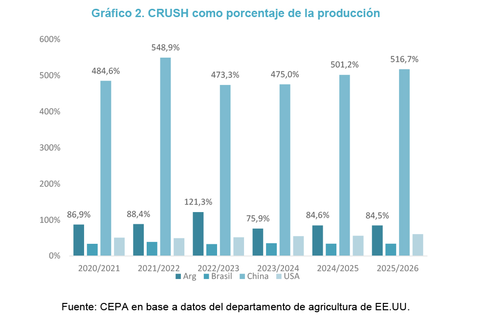 Lejos de ser una anomalía, procesar más poroto que el producido internamente constituye una política deliberada de agregación de valor, replicada a escala global. En este sentido, China se destaca como el principal actor, con niveles de crush significativamente elevados con relación a su producción, consolidándose como el mayor consumidor mundial de soja.