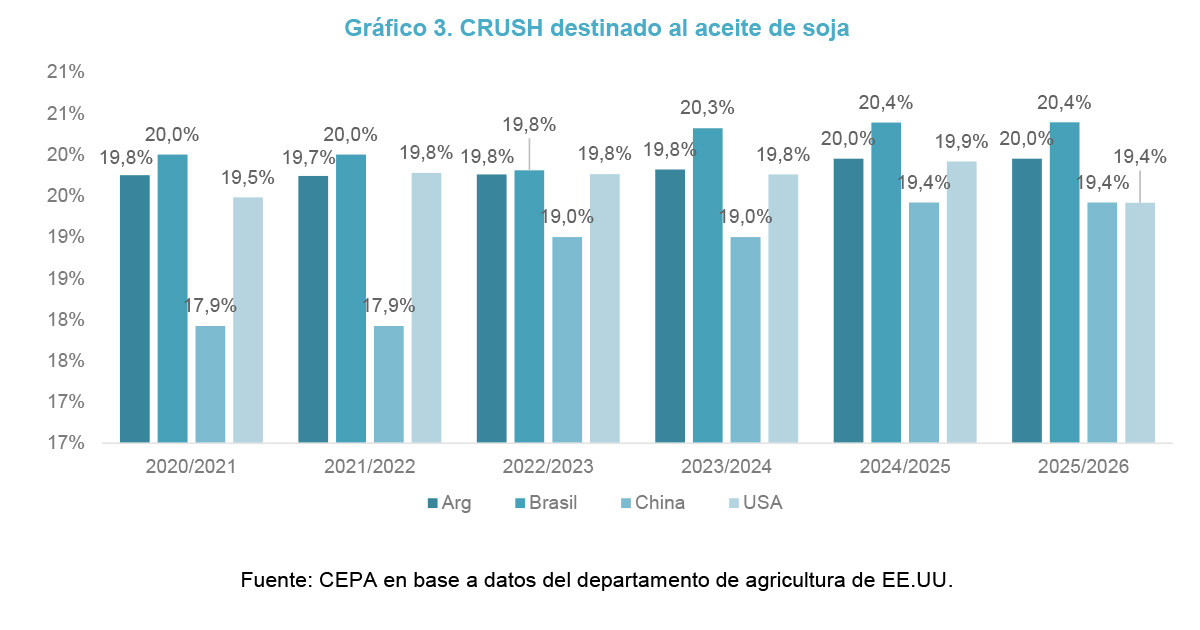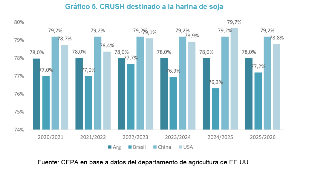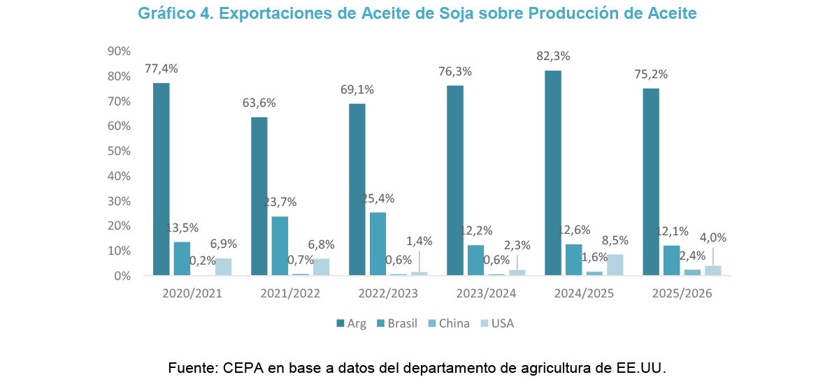 Sin embargo, a diferencia de otros grandes productores como Estados Unidos o China, en Argentina se observa una marcada orientación exportadora. En el caso local, tanto el aceite como la harina de soja se colocan en el mercado externo en etapas relativamente tempranas del proceso productivo, sin avanzar de manera significativa hacia instancias posteriores de transformación industrial. En consecuencia, el país consolida su rol como proveedor de insumos intermedios en la cadena global, resignando parte del potencial asociado a la industrialización avanzada y a la generación de empleo en sectores vinculados.