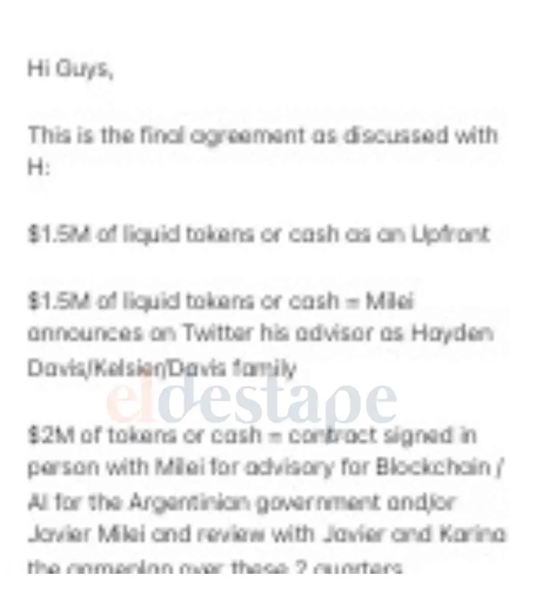 $2M en tokens o cash = contrato firmado en persona con Milei por asesoria en blockchain/AI para el gobierno argentino y/o Javier Milei y revision con Javier y Karina