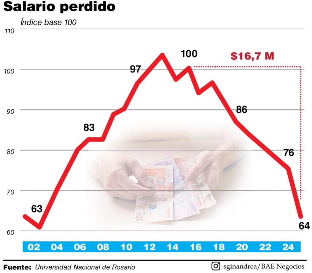 Otros análisis realizados por centros de estudio o consultorías económicas coinciden con esta conclusión a la que hemos precedentemente arribado. En un reciente trabajo preparado por el licenciado Julián Blejmar y publicado en el periódico BAE Negocios se consignan en base a datos oficiales informes de grupos de estudio correspondientes a cuánto perdió cada trabajador en promedio en la última década. El centro CIFRA dio a conocer datos de cuánto es la pérdida que correspondió a cada gobierno de tal modo que desde noviembre del 2015 a mediados de este año se acumuló una caída del salario real del 32%, con una baja del 20% durante la gestión de Macri, otra del 5% en la de Fernández, y una última de casi el 10% en los 6 meses de Milei. Un gráfico que acompaña este análisis preparado en función de un informe del Mirador de la Actualidad del Trabajo y la Economía, integrado por economistas e investigadores de la Universidad Nacional de Rosario, revela la evolución del salario perdido por los trabajadores a partir del año 2015 luego del fuerte incremento que obtuvieron en el lapso 2002 y el citado 2015. Ahí se advierte cómo en solo 6 meses de este año se produjo el mayor ritmo de caída de la pérdida del salario del conjunto de los trabajadores.