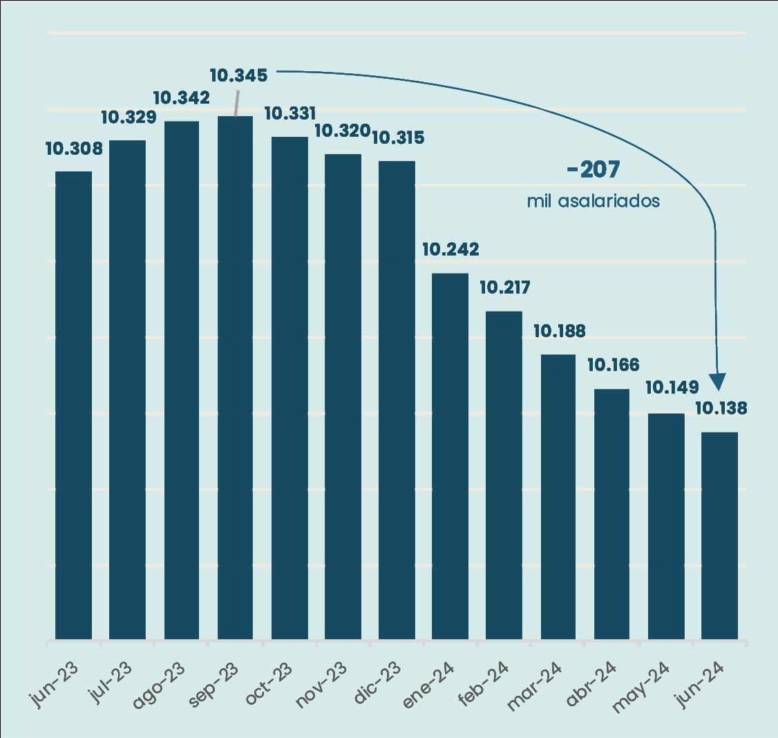 - Esta categoría de empleo registró en el mes de junio su décima caída consecutiva, comenzando su evolución decreciente un mes antes que el empleo asalariado total.
