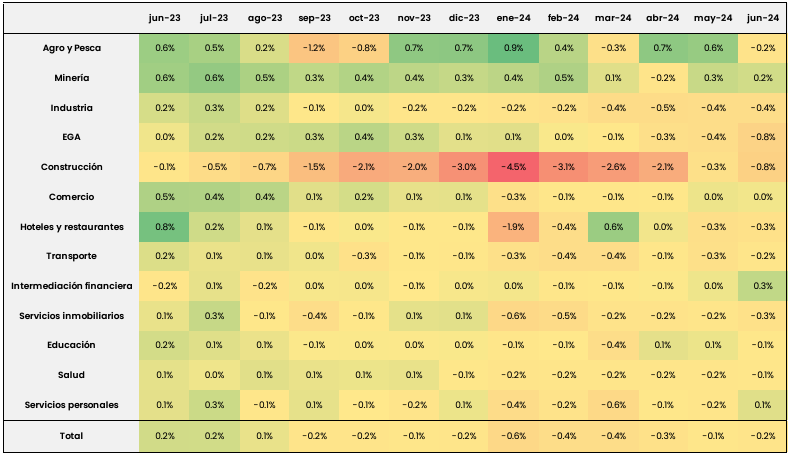 - La Construcción ha sido expulsora de empleo desde mediados de 2023. A junio de 2024 acumulaba 13 meses consecutivos de caída.