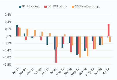 - Desde agosto de 2023 se observan tres fases diferentes en términos de la extensión de la caída del empleo según tamaño de la empresa considerado. Entre ese mes y noviembre las empresas grandes experimentaron crecimientos en su dotación de personal mientras que en el resto de las empresas alternaron caídas con leves crecimientos. Desde diciembre hasta junio la dinámica contractiva del empleo se extendió a los tres tamaños de empresas: aún las firmas más grandes redujeron el número de ocupados. En el mes de julio las empresas más grandes continuaron la fase descendente (-0,2%), las más pequeñas no registraron cambios significativos y las medianas incrementaron su dotación de personal (+0,4%).