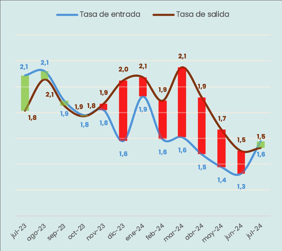 - Sin embargo, en el mes de julio se observa un quiebre en la reducción sistemática de la tasa de entrada ya que esta aumenta de 1,3% en el mes de junio a 1,6% en julio. Por su parte, la tasa de salida se mantuvo invariante entre ambos meses.