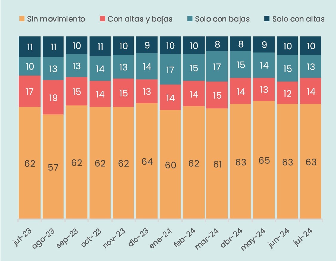 - Si bien el porcentaje de empresas que registraron solo bajas de personal en el mes de julio (13%) fue inferior al registrado en enero (17%) y también en junio (15%), continúa siendo más elevado que en julio de 2023 (10%).