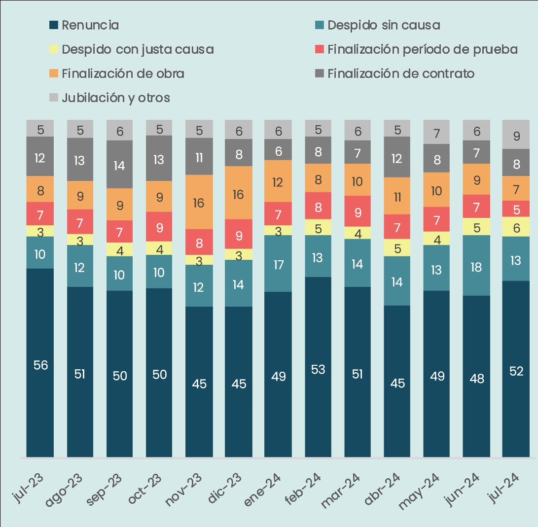 - Por el contrario, el porcentaje de terminación de la relación laboral asociado a los despidos sin causa pasaron de representar 10% en julio de 2023 a 13% un año después. De todas maneras, se observa un descenso de esta tasa respecto del mes anterior cuando alcanzó el valor máximo en los últimos 12 meses, de 18%.