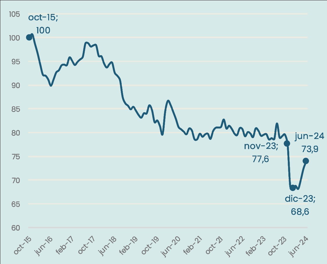 Octubre 2015–junio 2024. Índice oct-15=100. Pesos constantes jun-24.