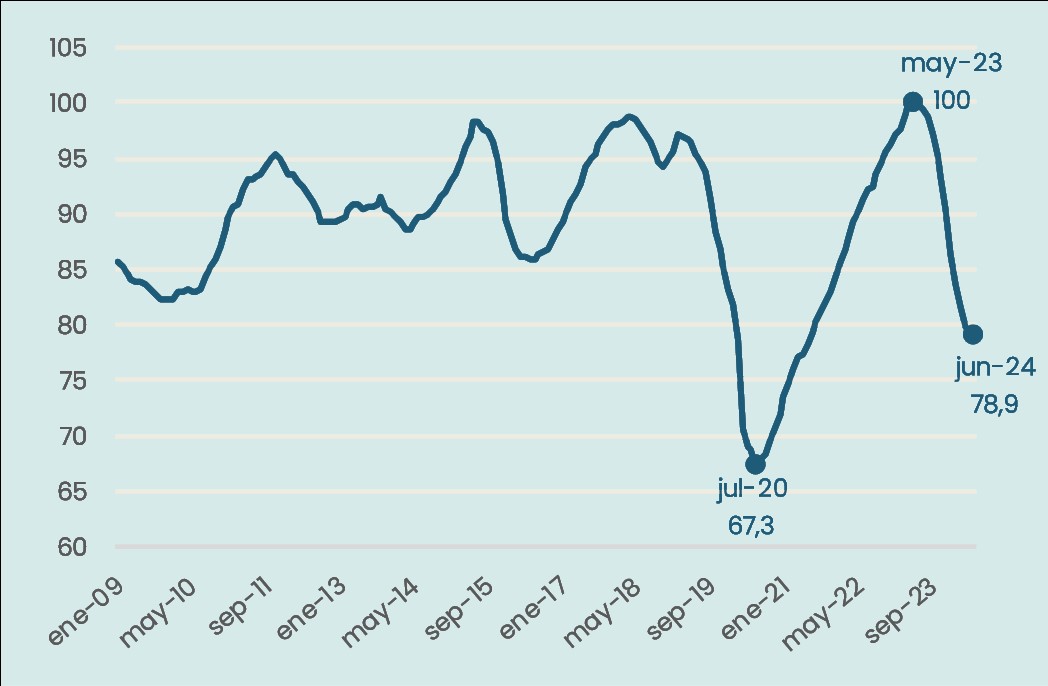 Enero 2009-junio 2024. Índice mayo 2023=100. Sin estacionalidad.