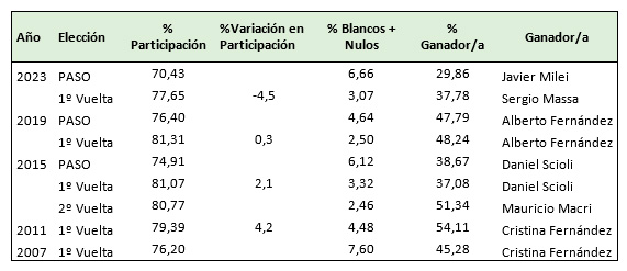 La comparación de los resultados de las elecciones presidenciales de los últimos quince años muestra tres puntos que queremos resaltar. Uno, que la participación en 2023 estaría reduciéndose un 4,5% respecto de 2019. Esto representa una baja con cierta significatividad, habrá que ver si se refrenda en la segunda vuelta. Dos, que el peronismo alcanza en primera vuelta un porcentaje similar al que obtuvo en 2015, pero con una trayectoria inversa: el 2015 redujo su caudal de votos respecto de las PASO, y en 2023 la incrementó. Tres, que desde 2007 a 2019 el voto blanco más nulo presenta una tendencia hacia la baja, mientras que 2023 se incrementó, aunque representó el 3,1%, una cifra no significativa, menor a las de 2007-2015.