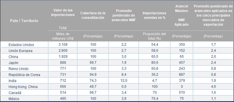Cuadro 1. Perfil arancelario de los principales 10 países/territorios importadores