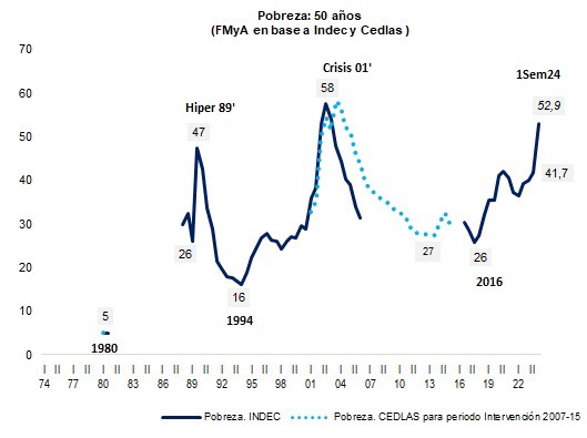 El índice se eleva levemente al 30 % al final del periodo presidencial de la citada mandataria para luego, durante el periodo macrista, se cierra el tramo cuatrienal del mandato del Ing. Macri ya en torno del 35 % y en franco ascenso, con solamente un solo año con valores similares a la etapa previa a dicho gobierno pero que resultó ocasional y sin marcar tendencia., Cuando asume el Dr. Alberto Fernández, la tasa de pobreza sufre un fuerte impulso- de 35 al 42 % del total de la población por los efectos muy negativos de la Pandemia y la correspondiente cuarentena que trabó el desenvolvimiento normal de la economía argentina En el 2022, con la eliminación de los efectos negativos de la Pandemia volvió a reducirse el índice de pobreza al 36,5 %, año sin contingencias especiales desfavorable Lo que diríamos un año normal según las condiciones de desenvolvimiento de la economía ,descenso que se revirtió al año siguiente Nuevamente trepo a más del 41 % en 2023,interrumpiendo la senda de su descenso porque la sequía distorsiono el mercado de alimentos y se pagaron las consecuencias del nuevo acuerdo de crédito con el FMI que contrajo Macri y las exigencias de este organismo para su paulatina cancelación, lo que supuso una caída del PBI del 1,7 % en ese año Pero el gran salto fue en este primer semestre, que implicó un incremento sustancial al 52,9 %, o sea más de 11 puntos de porcentual en solo seis meses. Hacía 20 años que no se producía una caída tan significativa y en tan escaso tiempo de la salud social de nuestra población