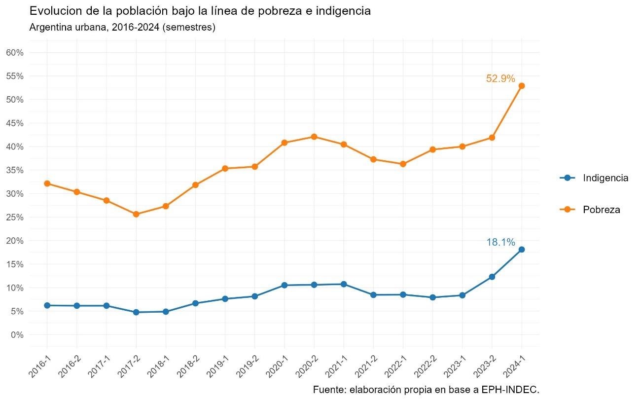 El aumento de la pobreza y la indigencia se registra en mayor medida para el período 2024 en forma casi exclusiva, con un crecimiento de dichos indicadores en forma pronunciada, llevado la pobreza a niveles muy elevados en de los últimos 20 años en Argentina (52,9%). La misma situación para la población en condiciones de indigencia (18,1%).
