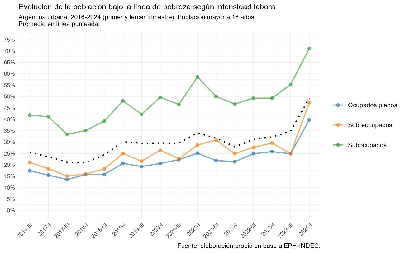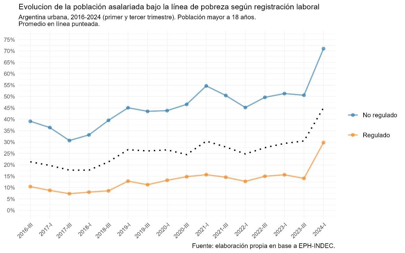 El fenómeno de los "trabajadores pobres": Uno de los hallazgos más importantes es la creciente presencia de "trabajadores pobres", quienes, a pesar de estar empleados, no logran superar la línea de pobreza. Este fenómeno es más agudo entre los trabajadores no registrados, con una tasa de pobreza superior al 70%, mientras que los trabajadores regulados enfrentan una pobreza del 30%. Esto evidencia que el empleo formal, aunque brinda cierta protección, no es suficiente para mitigar el impacto de la crisis.