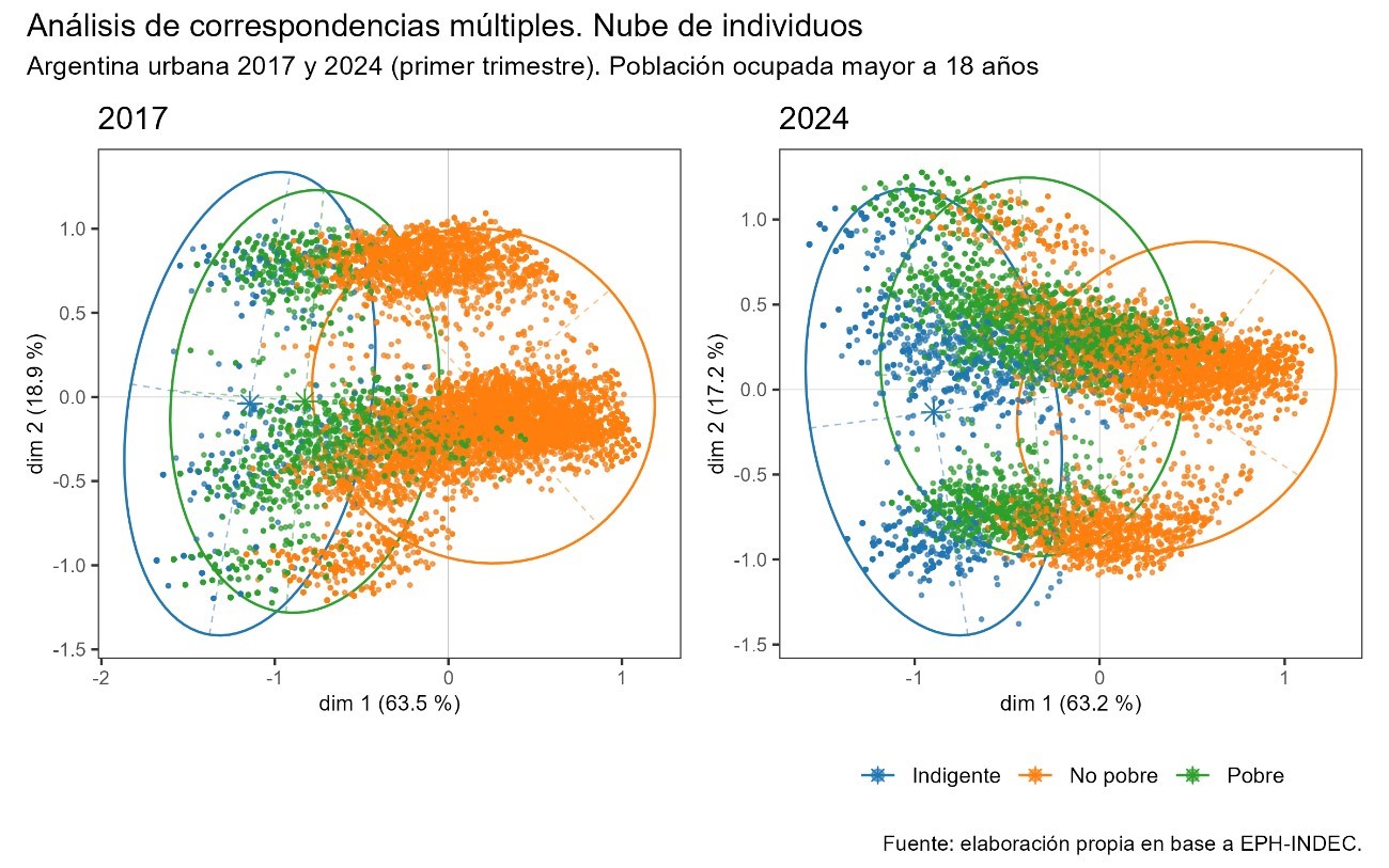 En el periodo analizado, se observa un aumento en la proporción de personas en situación de pobreza e indigencia (representadas por los puntos verdes y azules en el gráfico). No obstante, es importante señalar que este incremento no solo responde a una peor distribución de ingresos o al deterioro de las condiciones laborales. También se nota una mayor exposición a la pobreza y la indigencia en los sectores intermedios del espacio social, lo cual queda evidenciado al observar las elipses de concentración.
