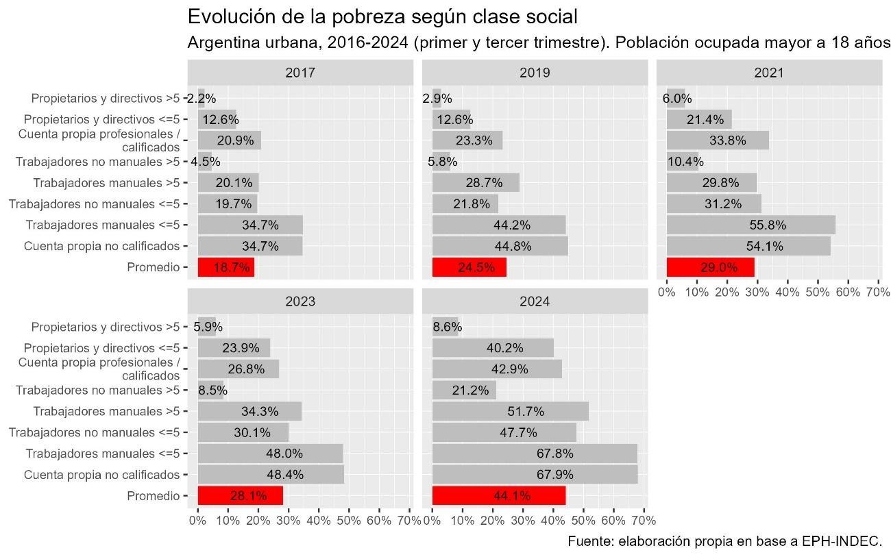 No obstante, si abordamos el problema desde una perspectiva relativa, es evidente que la pobreza ha crecido notablemente en las clases medias, en particular entre los trabajadores no manuales de grandes establecimientos y los propietarios o directivos de pequeños negocios. En estos grupos, la pobreza se ha triplicado en tan solo siete años. Un aspecto relevante en los últimos años es el crecimiento de la pobreza entre los trabajadores con empleo formal o regulado.