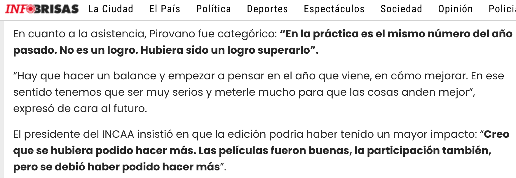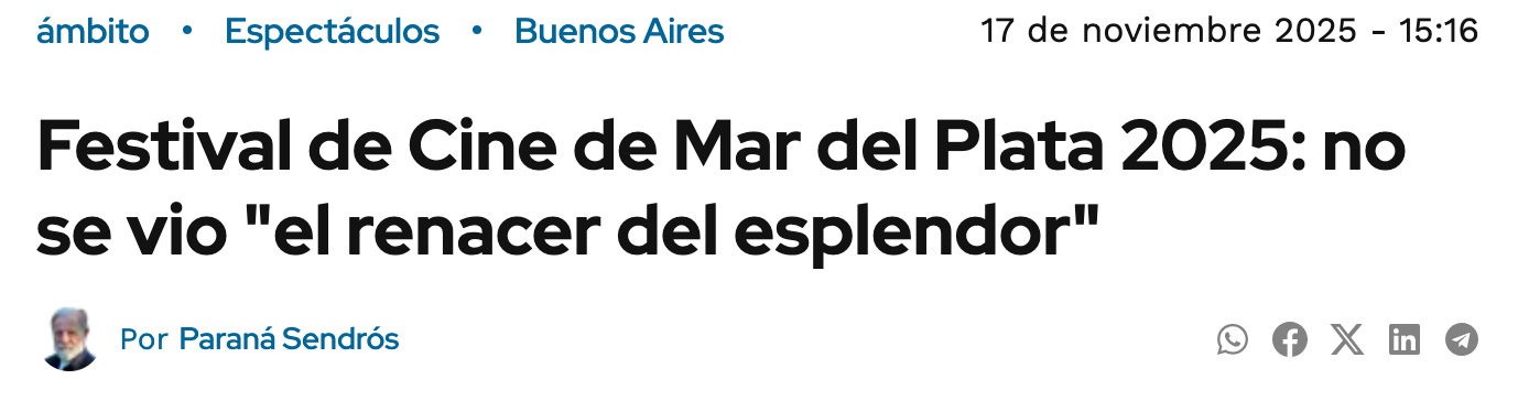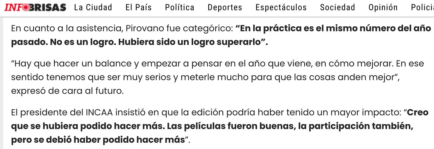 No parece haber signos de algún tipo de introspección sobre su trabajo en la programación, o sobre el problema de haber pretendido cobrarle al público el precio pleno de la entrada a una película para proyectarle pilotos de series a las que no les faltará mucho tiempo para estar disponibles en las plataformas. Ni una idea sobre cómo sus funciones favoritas en el festival fueron la copia de una receta sostenida por años en gestiones anteriores. Nada para pasar en limpio de los muy esperables resultados de querer cambiar drásticamente el perfil y la audiencia del festival en menos de dos años (el spot de resumen durante la ceremonia de cierre no incluyó una sola imagen de espectadores en una sala llena o en una fila larga). Mucho menos preguntarse en cuánto contribuirá a la imagen del festival salir en los medios quejándose de la organización del festival. Solo se trata de pedir más plata a los empresarios de la ciudad.