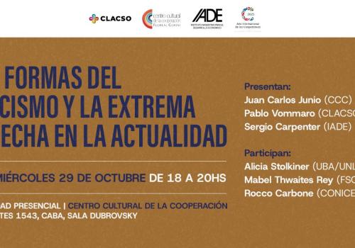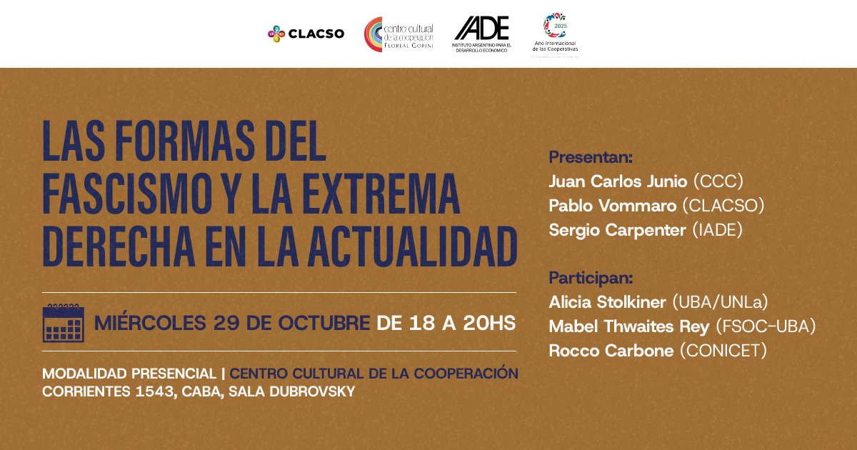 En el marco del ciclo “A 80 años de la derrota del nazismo, desafíos democráticos de ayer y de hoy”, organizado por el Centro Cultural de la Cooperación (CCC), el Instituto Argentino para el Desarrollo Económico (IADE) y el Consejo Latinoamericano de Ciencias Sociales (CLACSO), se realizará la charla-panel “Las formas del fascismo y la extrema derecha en la actualidad”, cuarta y última actividad del ciclo.