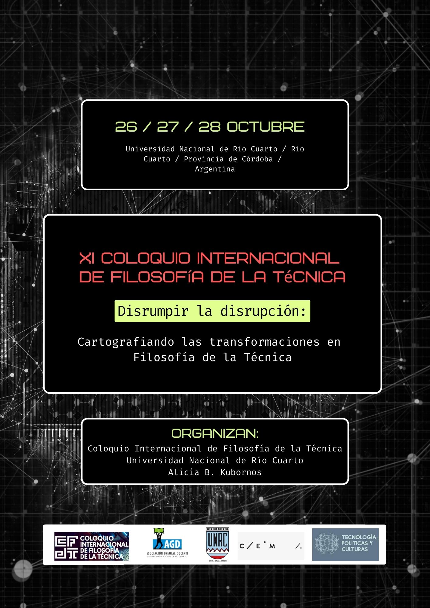 Con el desafío de retomar la organización del Coloquio Internacional de Filosofía de la Técnica tras el contexto pandémico y atendiendo a que la reflexión filosófica sobre la técnica y la tecnología se enfrenta a nuevos retos, principalmente debido a la acelerada evolución de las tecnologías digitales y su impacto disruptivo en la vida social y política, proponemos que la reflexión de este Coloquio gire en torno a una cartografía de las transformaciones del pensamiento sobre la técnica en los últimos tiempos y sus futuros posibles. Se trata tanto de poner en el mapa la diversidad de problemas y discusiones y su impacto en el ámbito social y político, como de entender los modos del acoplamiento de tecnologías, subjetividades y culturas en un contexto de tecnologías distribuidas y ubicuas.
