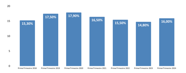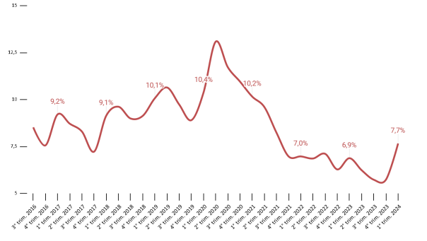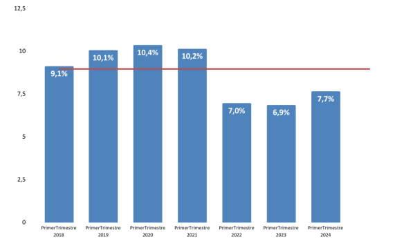 La tasa de desocupación se ubicó en 7,7% en el primer trimestre de 2024, lo que marca un alza de 0,8 p.p en relación con el mismo período de 2023 y se encuentra en el nivel más alto para un primer trimestre desde la pospandemia.